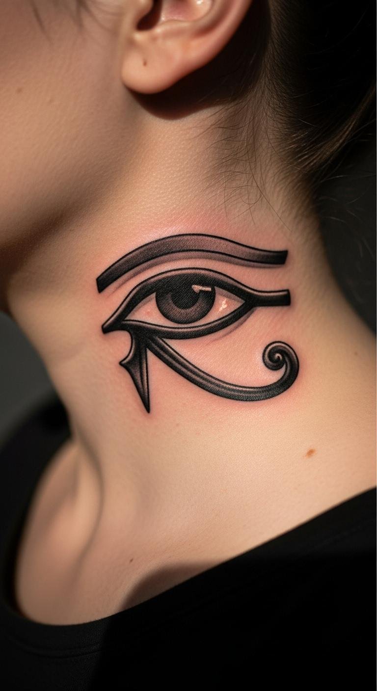 Opt for the Eye of Horus on your neck to show strength openly. This area makes the symbol a bold statement. Draw templates on your neck with safe markers. Use necklaces with similar designs for trials. Choose straightforward lines to reduce costs. Search for promo sessions at studios. Customize with a ray for depth. It enhances confidence in photos or meetings. Try at home: Tape a paper cutout to your neck. This design puts power in plain sight.