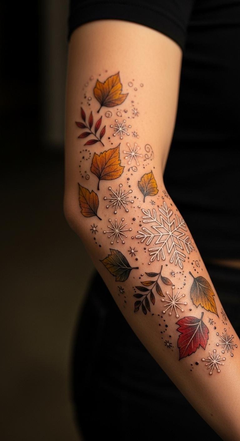Seasonal tattoos capture moments like falling leaves. They keep the spirit of change alive. Sketch based on the seasons.