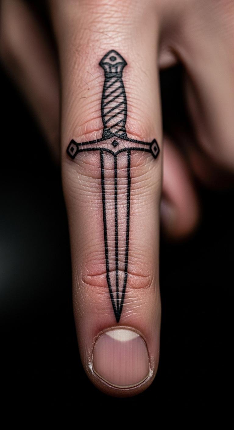 Dagger tattoos on fingers stand for courage. Draw a straight blade design. Free dagger templates online assist. Expect $50 for the work. Bandage it initially. Pair with themes. Try with fake tattoos. It sharpens your style.