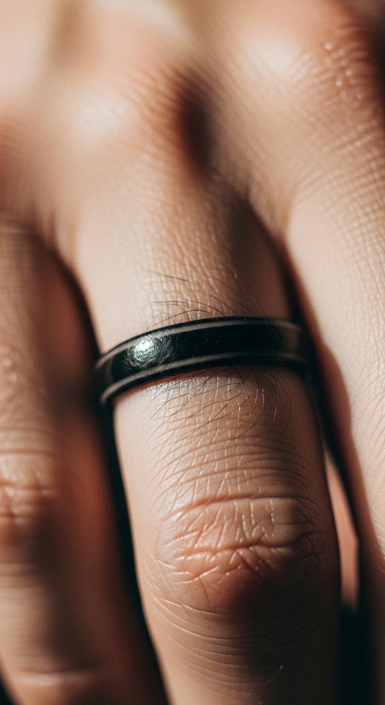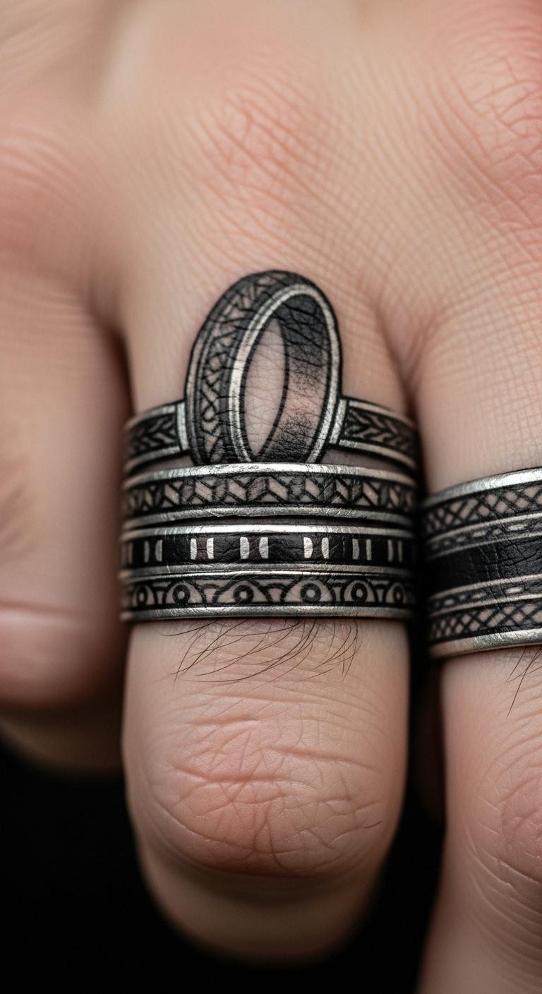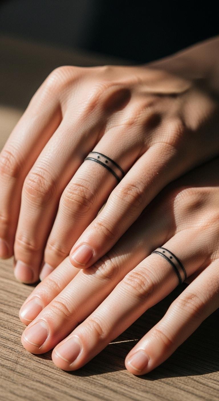 Ring finger bands mimic jewelry. Stack thin lines. Measure with string. Free band designs online. Tattoo for $40. Maintain with cream. Vary widths. Use temporary bands. This option is practical.