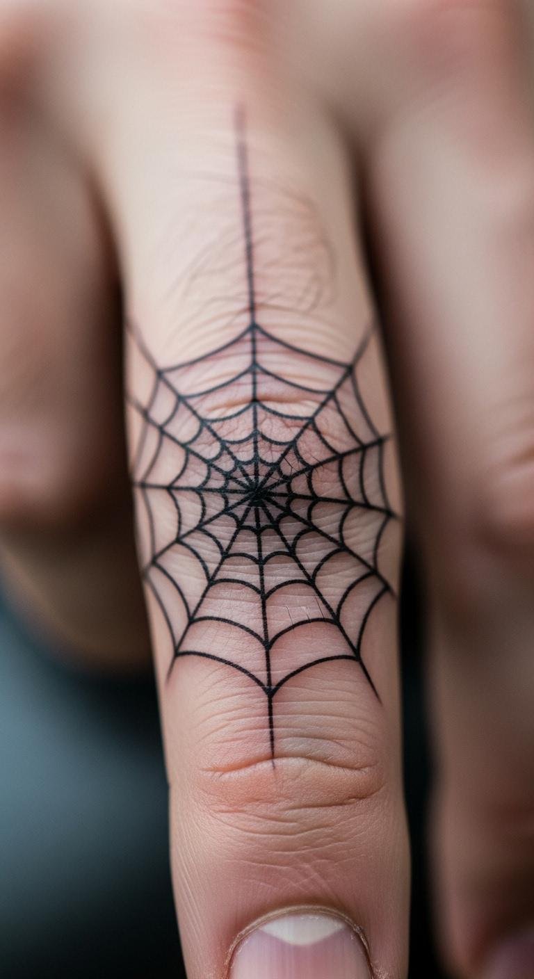 Spider web tattoos on fingers symbolize protection or traps. Weave it across the finger. Plan with sketches on paper. Free web generators help. Sessions are around $45. Use gloves for healing. Add spiders for extra flair. Test with temporary ink. It creates a cool, mysterious look.