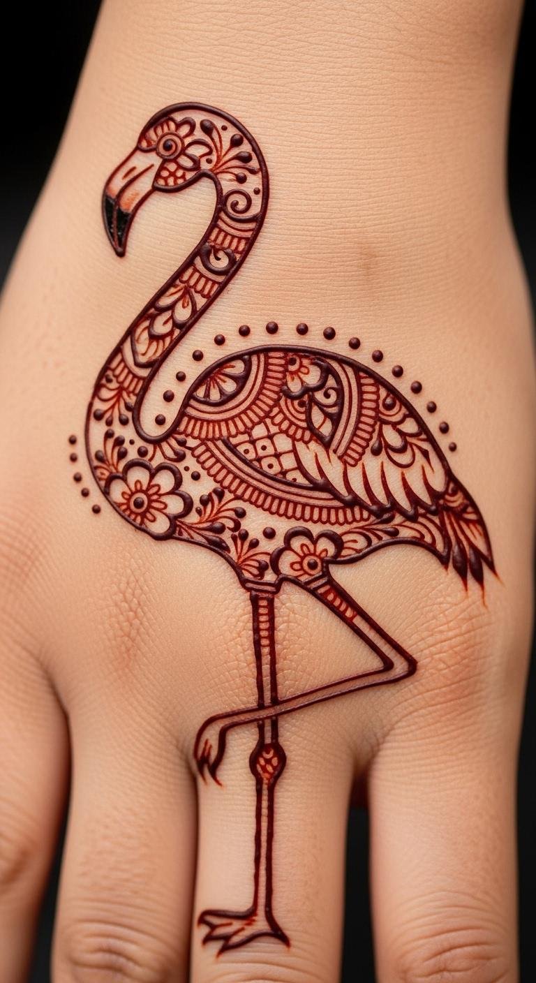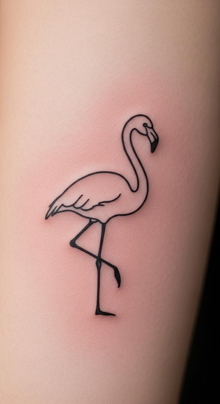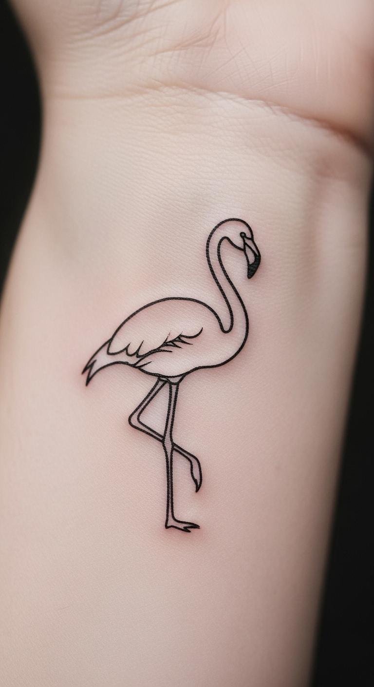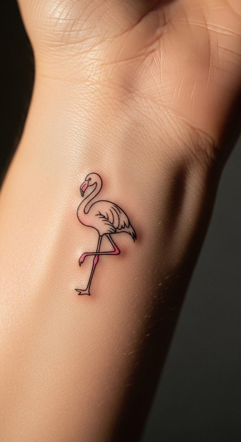 Just a clean line drawing of a flamingo keeps it sleek. No extra colors needed here. Draw outlines yourself with a sharpie on paper. Free design tools online help you refine it. Aim for a tiny spot to save money, maybe $50 or less. Wear it on your finger for a discreet touch. Add a small curve for personality. This style works for busy days and everyday clothes. It’s quick and easy to decide on.