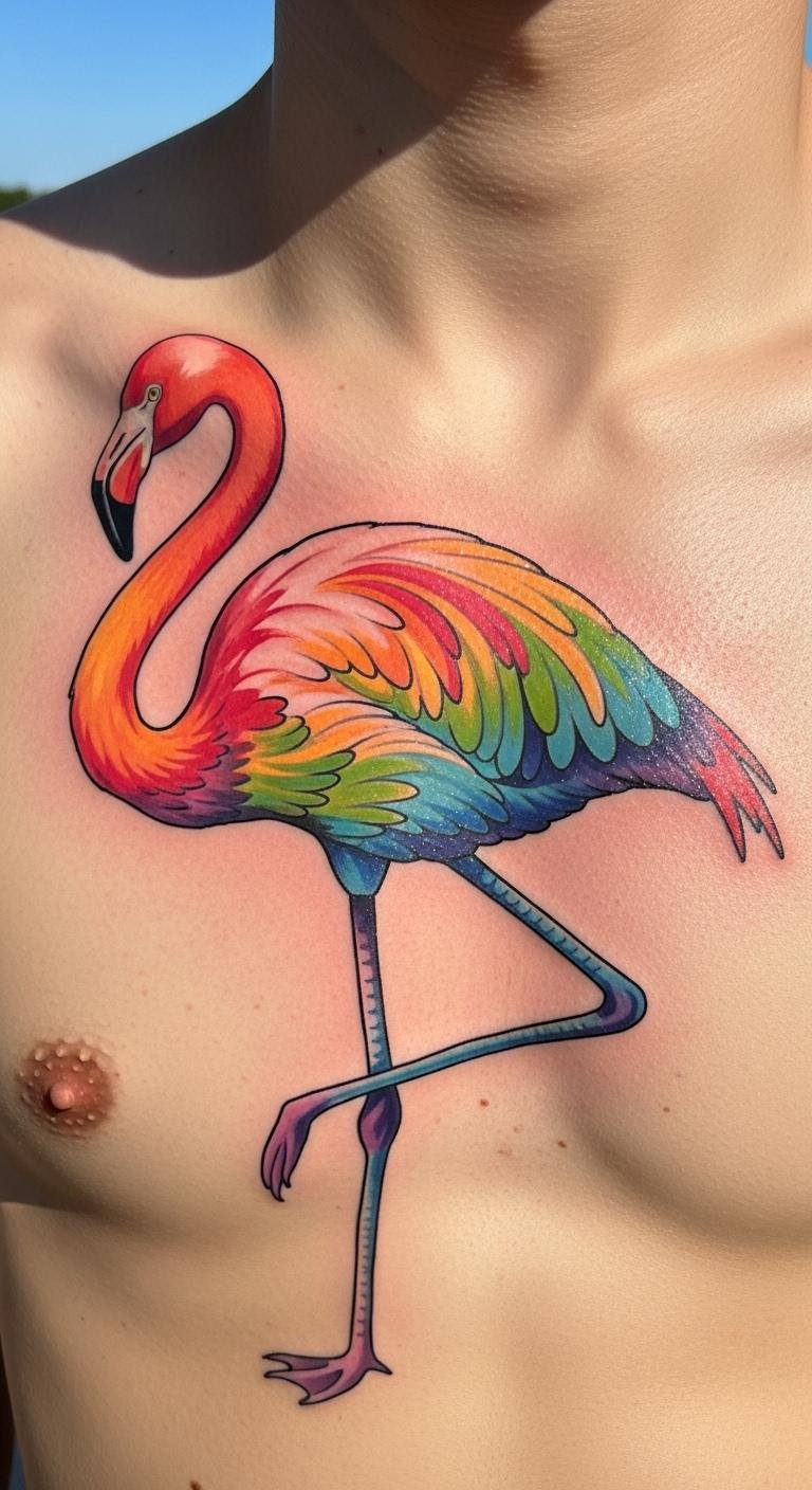 Layers of color make this flamingo a standout piece. Think reds, yellows, and blues. Mix paints at home for fun. Apps offer free color palettes. Budget $350 for vibrancy. Position on your side. Use fabric dyes for tests. This design celebrates your energy.