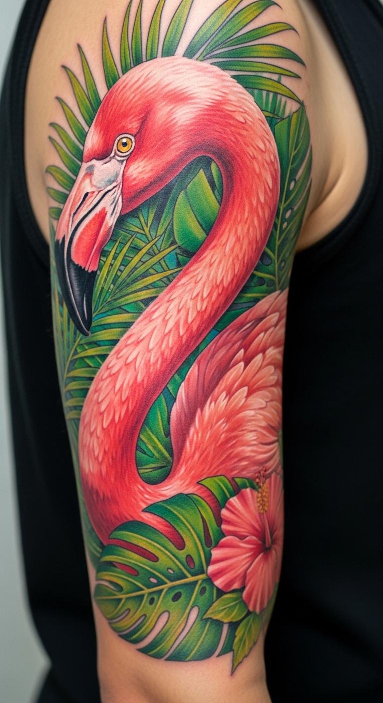 A half-sleeve flamingo covers your arm in style. It tells a big story. Plan with arm sleeves. Online guides are free. Expect $500. Flow it with your muscles. Use bandages for mock-ups. This design makes a statement. Choose themes from your life.