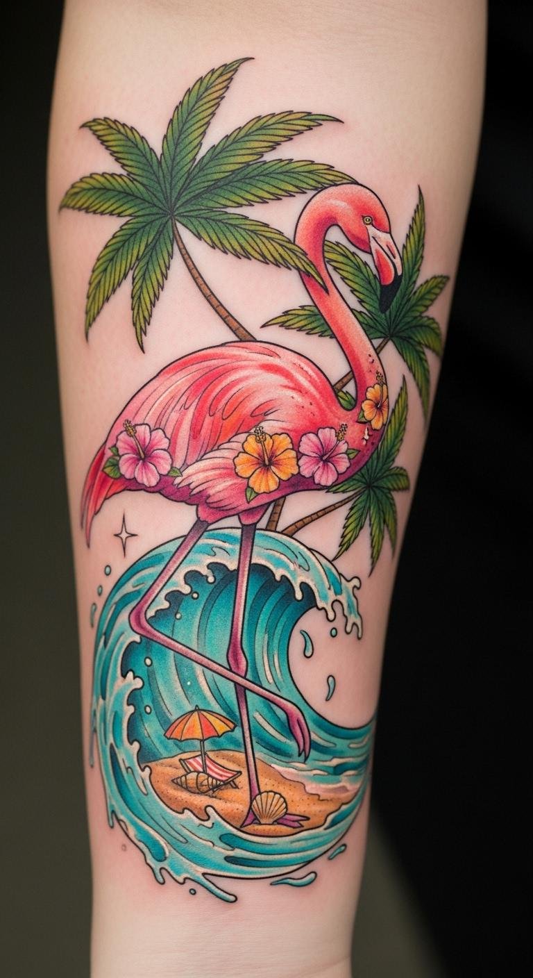 Bring in palm trees and water around your flamingo. This creates a full story on your skin. Sketch scenes on paper with colored pencils first. Look for free nature images online for ideas. A smaller version keeps the price under $300. Put it on your calf for balance. Use household items like leaves to inspire details. This idea suits beach lovers and adds adventure to your look. Make it your own with simple tweaks.