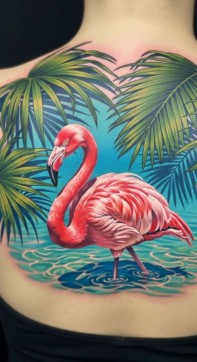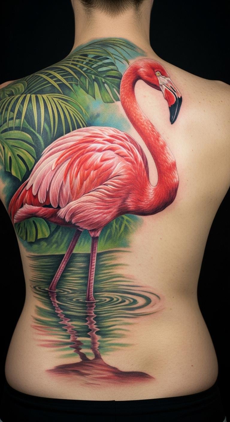 The back gives room for a big flamingo story. It flows with your body. Plan with full-body mirrors. Online tools offer free layouts. Budget $400 for larger work. Center it for symmetry. Use string to outline at home. This design turns heads in mirrors. Make it reflect your travels.