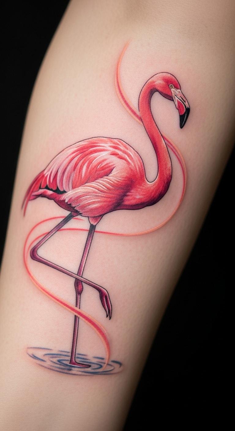 Your forearm offers space for a flamingo that moves with you. Think about the bird’s pose fitting your arm. Trace ideas on your skin with washable markers. Free apps simulate placements. A forearm tattoo can be budget-friendly at $150. Angle it for daily views. Add a wave line using string at home. This spot makes the design feel active. Choose colors from your favorite shirt.