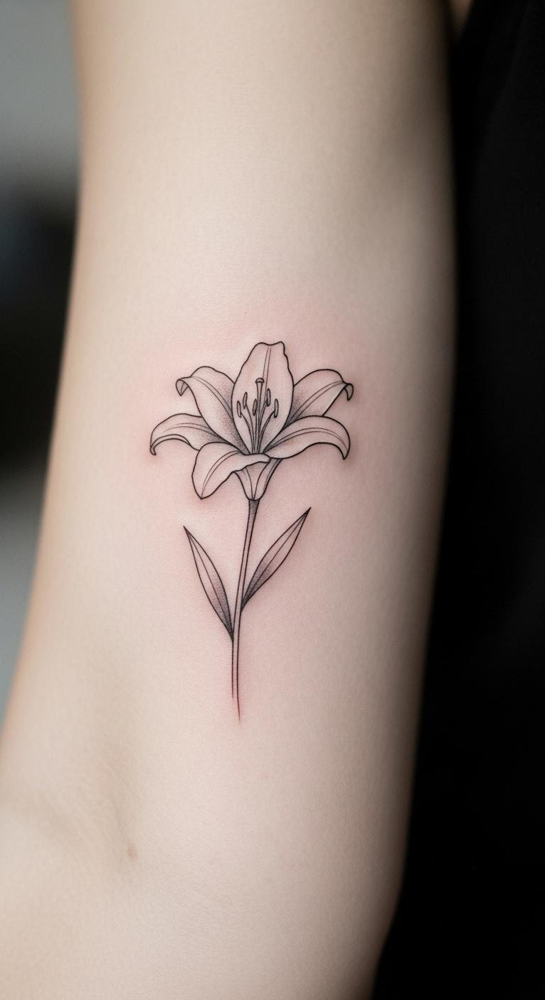 Think about a simple lily that says a lot with just a few lines. This design keeps things clean and understated. Start with a sketch on paper to see how it flows. For budget tips, use free online tattoo design apps to experiment before visiting an artist. Get a friend to draw it temporarily with henna for a trial run. Choose black ink to save on costs. This idea works well for first-timers. Pick a spot on your forearm that shows off the flower without overwhelming your look. Add personal touches like a small stem for meaning. Keep the process simple and fun. You’ll end up with something timeless.