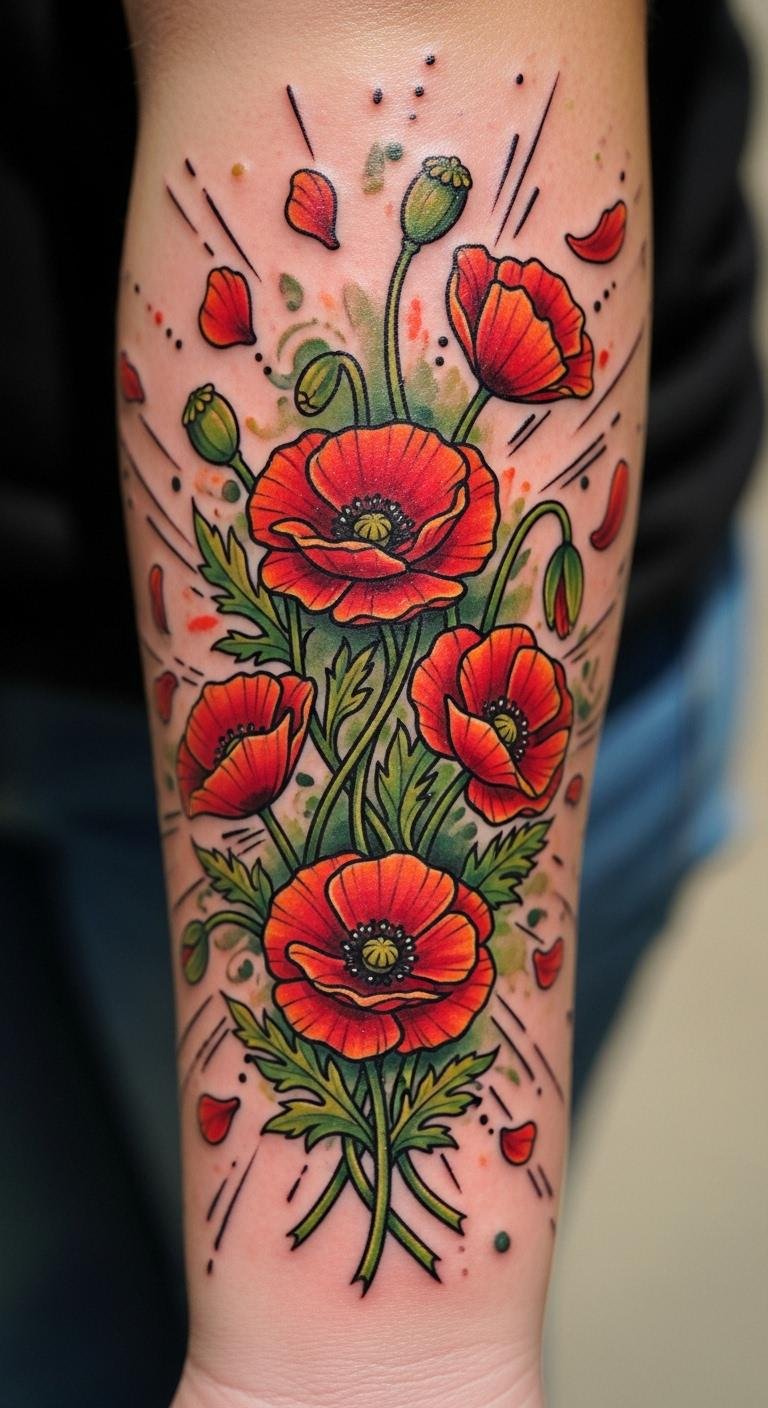 Pop a traditional poppy with bold edges. It draws from old-school styles. Find classic poppy art online at no charge. Outline it with bold markers at home. Stick on a temporary version to check. Use basic colors to save. Center it on your forearm boldly. This design has character. Adapt the poppies to your liking. It stands out strongly.