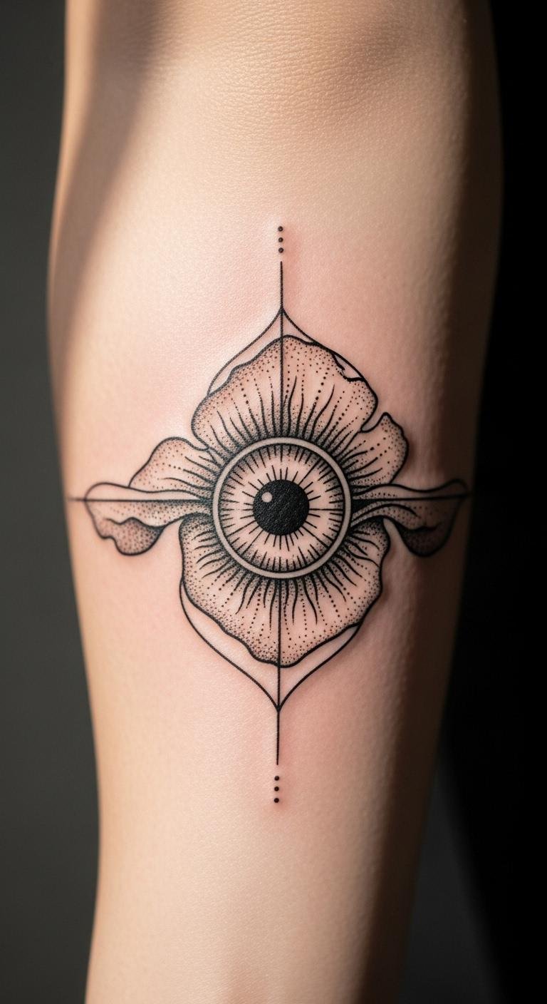 Fuse dots and lines for an iris flower. It mixes techniques for interest. Mix dot and line ideas from free sites. Draw a hybrid on paper with both methods. Test with a dot pen and line marker. Keep it to one flower for budget. Place the iris mid-forearm. This approach is creative and easy. Make it yours with added details. The effect is unique.