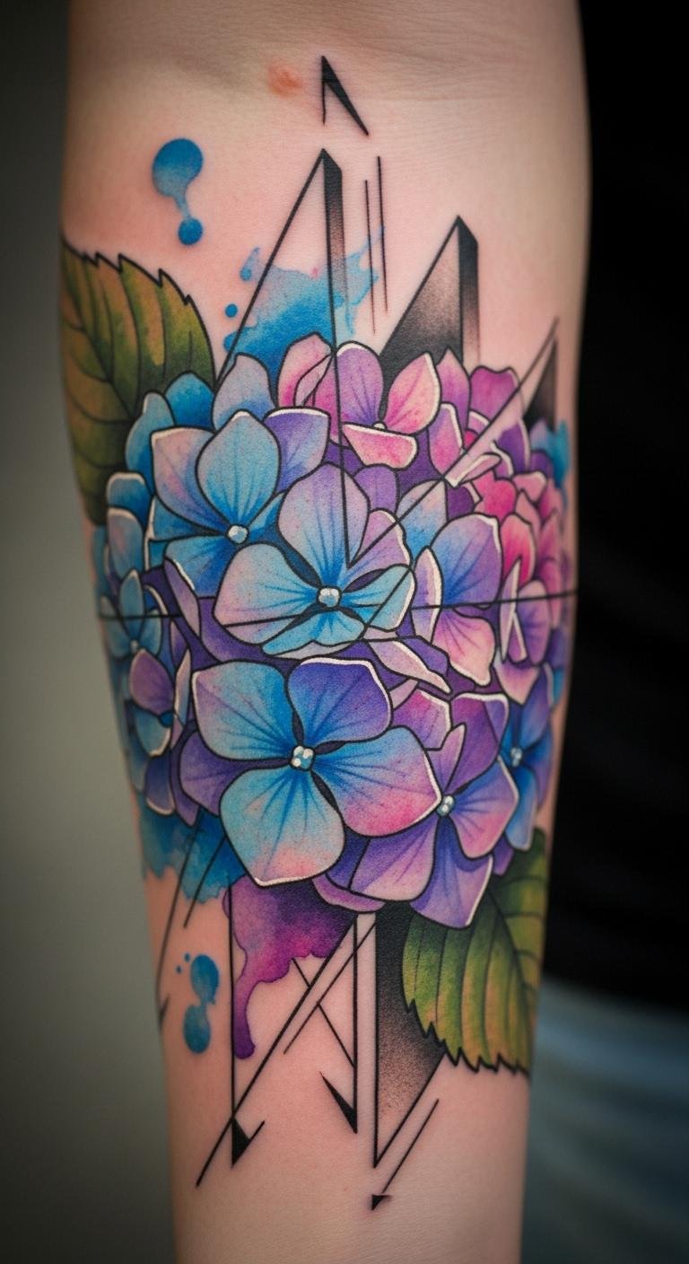 Combine watercolor with geometric shapes for a hydrangea. It adds layers to the design. Blend ideas from online resources. Paint a sample at home with watercolors. Use shapes cut from paper for a test. Focus on key elements to cut expenses. Arrange it on your forearm artfully. This design is innovative yet simple. Customize the blend for you. It creates a balanced look.