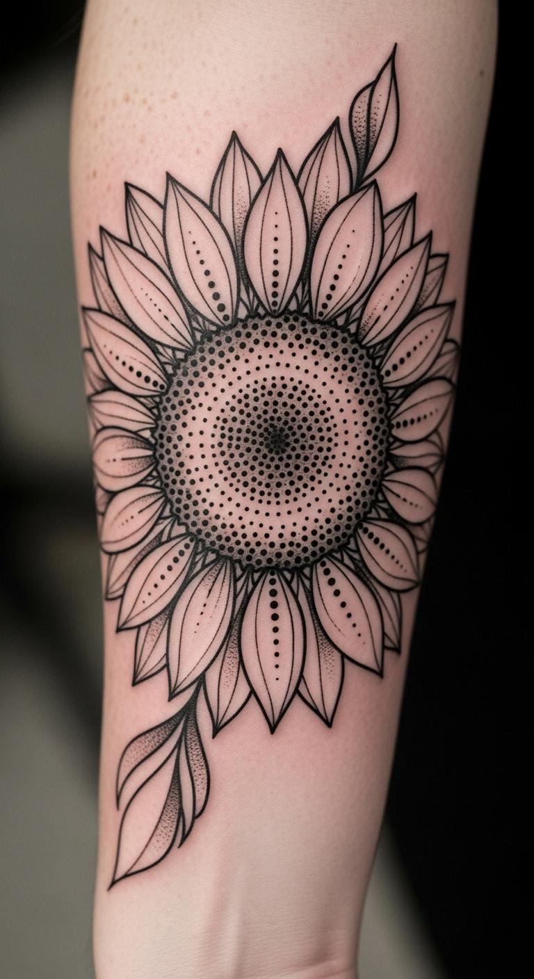 Pair lines with dots on a sunflower. It builds texture step by step. Find free tutorials online. Practice on paper with lines and dots. Apply a mixed temporary tattoo. Keep the sunflower compact. Fit it neatly on your forearm. This design is playful and textured. Make adjustments for your style. The result is engaging and fun.