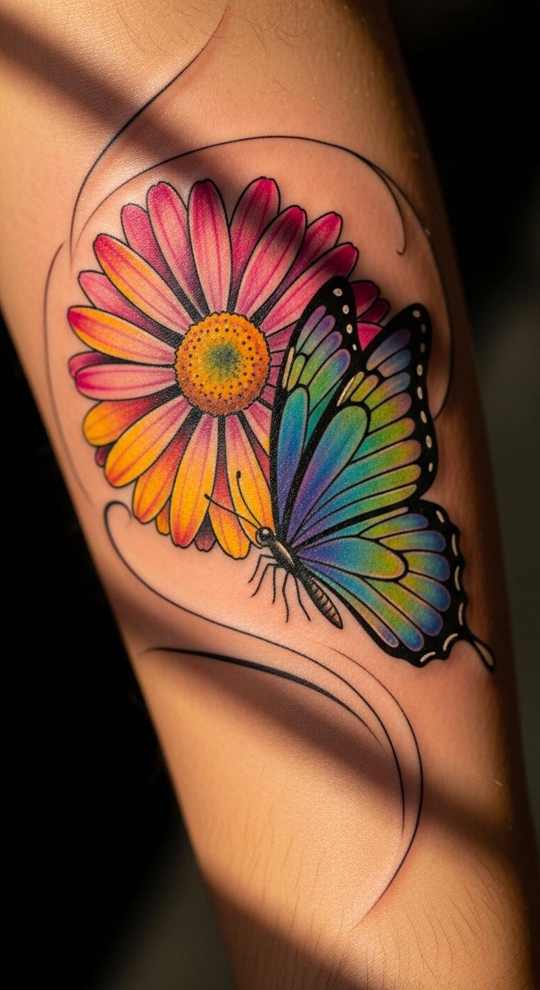 Add a butterfly to a colorful daisy. It creates a lively scene. Gather ideas from free nature sites. Paint the combo at home. Use stickers for a quick view. Limit colors to stay cheap. Place them side by side on your arm. This design feels whimsical. Personalize the butterfly’s wings. It adds movement and charm.