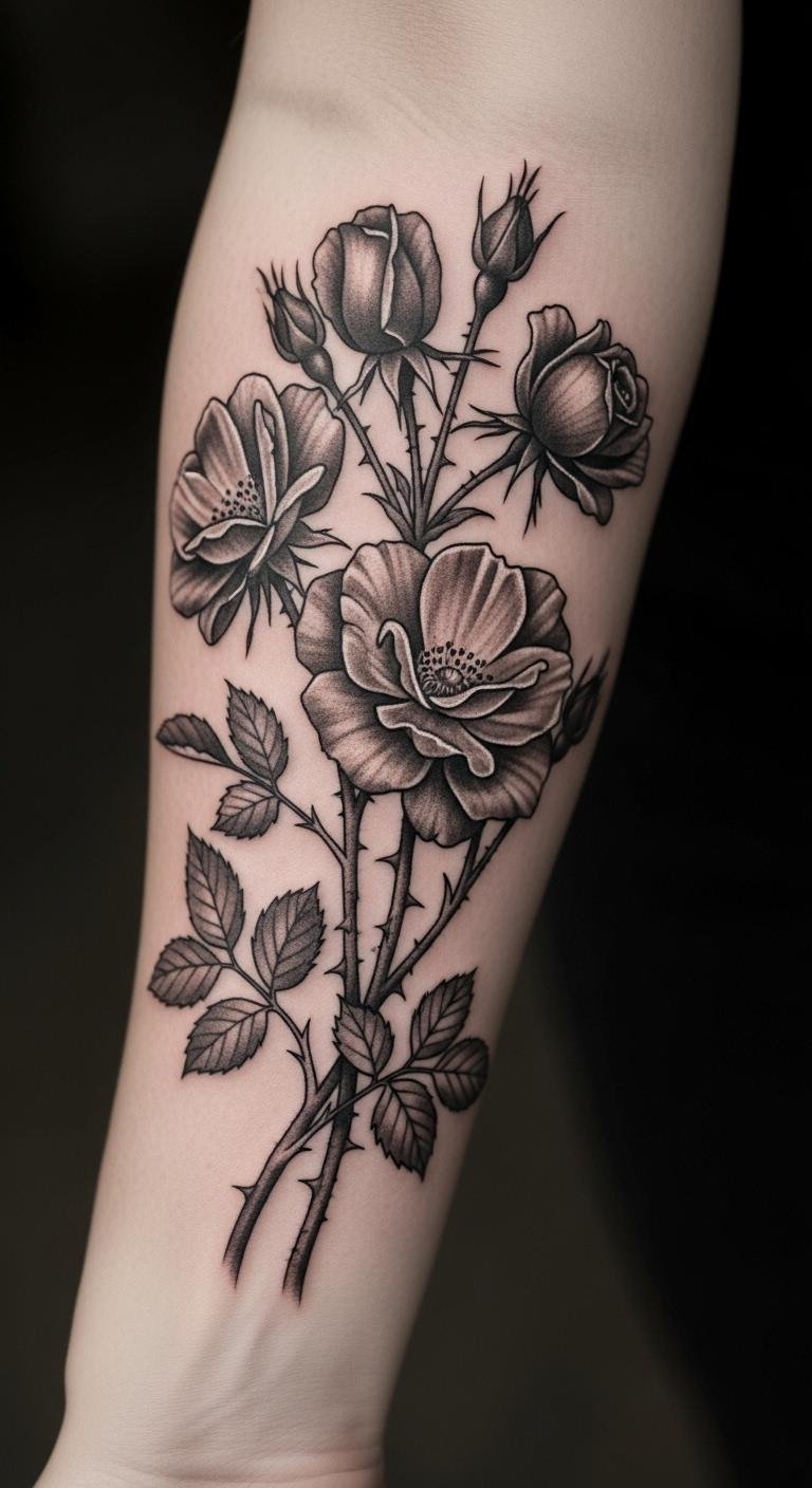 Shade a wild rose in gray for depth. It highlights the flower’s wild side. Look for gray rose examples online. Sketch it in shades at home. Test with gray pencils on skin. Opt for a single rose. Set it on the forearm prominently. This style is enduring. Adapt it to your narrative. It offers a strong finish.