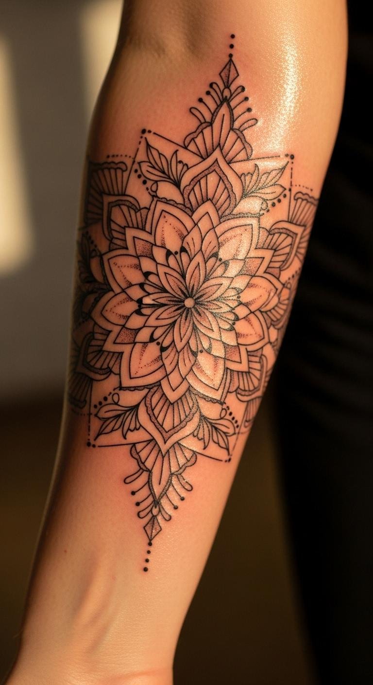 Form a mandala with geometric florals. It’s symmetrical and soothing. Find mandala templates online. Draw one on paper at home. Use string art for a home model. Keep the design basic. Center it on your forearm. This idea is meditative. Customize the flowers inside. It creates a focused piece.