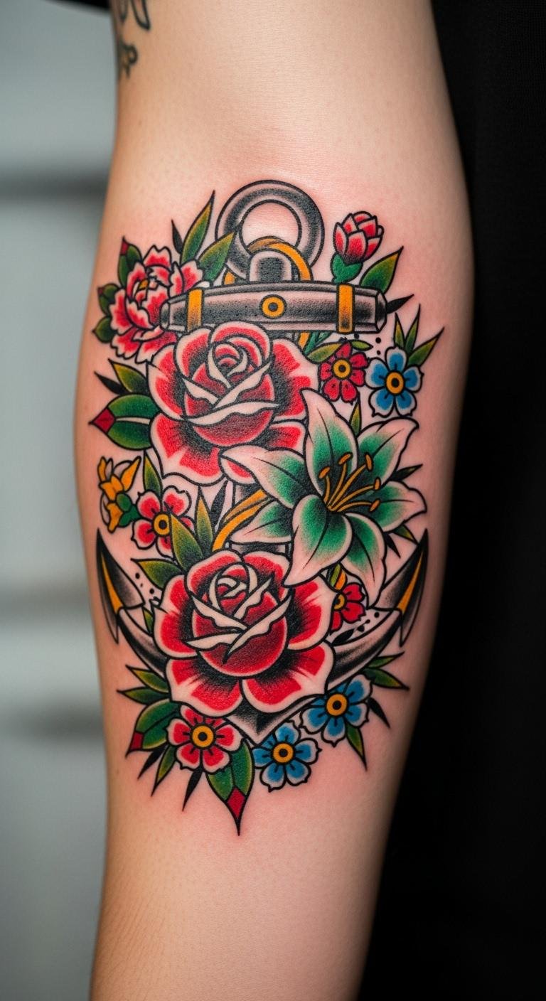 Anchor with traditional flowers for stability. It mixes symbols smartly. Find anchor-flower combos online. Outline it boldly on paper. Apply a temporary anchor design. Use traditional styles to save. Place the anchor at the base. This idea grounds you. Personalize the flowers around it. It offers solid inspiration.