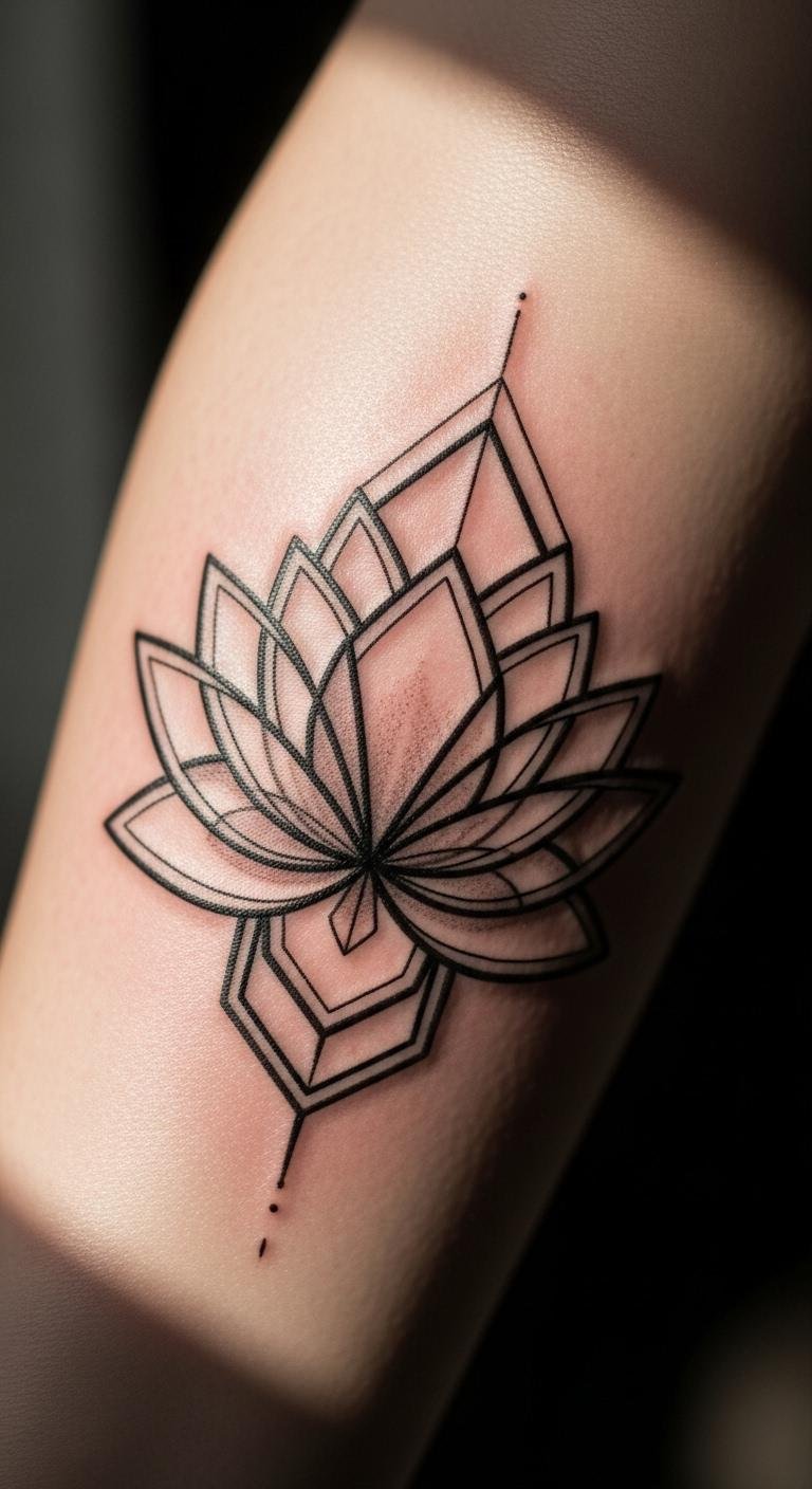 Mix shapes with a lotus for a modern twist. This outline uses angles to frame the flower. Find geometric templates online at no cost. Use string and pins at home to map it out. Try paper cutouts on your arm for a quick mock-up. Go with basic lines to keep expenses low. Place it on the inner forearm for subtle appeal. This design stands out yet stays simple. Customize the shapes to fit your taste. You’ll love the clean finish.