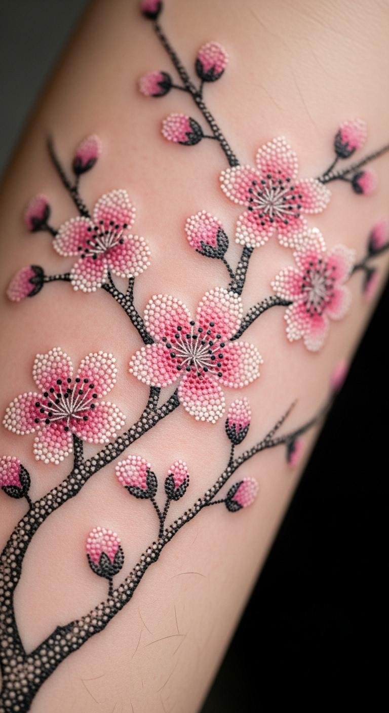 Build a cherry blossom with dots for a textured feel. It creates depth using small points. Search free dotwork tutorials to plan ahead. Practice with a dot marker on paper at home. Use a DIY stamp set for a temporary version. Stick to one flower to save money. Position it along the forearm for flow. This method adds detail without complexity. Make it personal with added dots for meaning. The outcome is detailed and affordable.