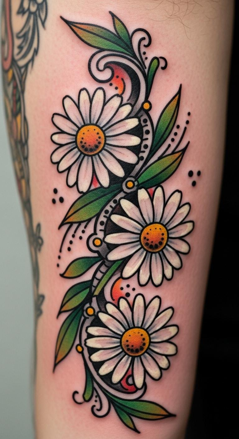 Link daisies in a bold, colorful chain. This style updates classics with flair. Browse free neo-traditional examples online. Draw the chain with colored markers for a home trial. Use fabric paints on a sleeve to preview. Opt for fewer flowers to keep it cheap. Wrap it around your forearm neatly. This adds fun without overdoing it. Personalize with your favorite colors. The result is lively and engaging.