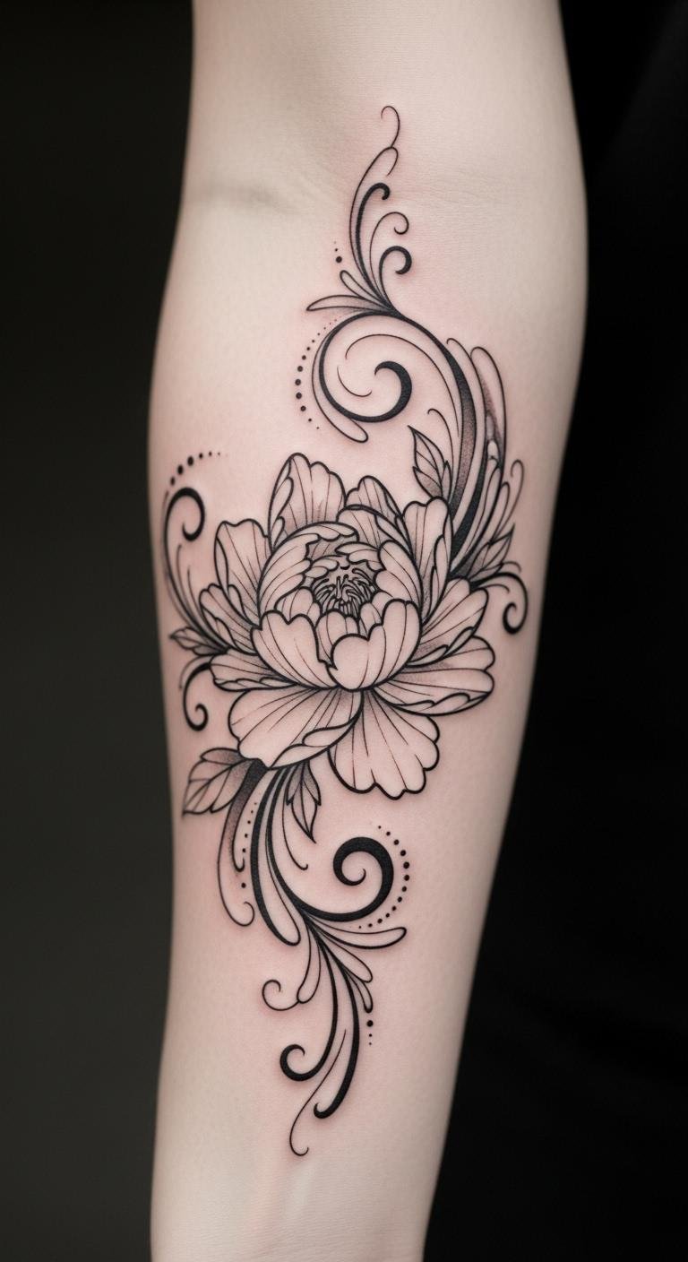 Let lines swirl into a peony shape. It’s all about elegant curves. Find line art guides online for free. Trace it on paper with a pen at home. Use washable ink on your skin for a test. Keep lines simple to stay on budget. Curve it along the forearm for grace. This design is understated yet striking. Add swirls that mean something to you. It turns out beautifully simple.