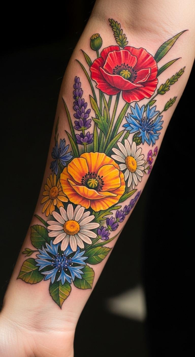 Blend wildflowers in a rainbow of colors. This mix feels free and vibrant. Collect flower images online to combine ideas. Paint a version on canvas at home cheaply. Try sticker sets for a temporary look. Select a few flowers to cut costs. Scatter them across your forearm creatively. This design sparks joy easily. Make it unique with seasonal blooms. The final piece is full of life.