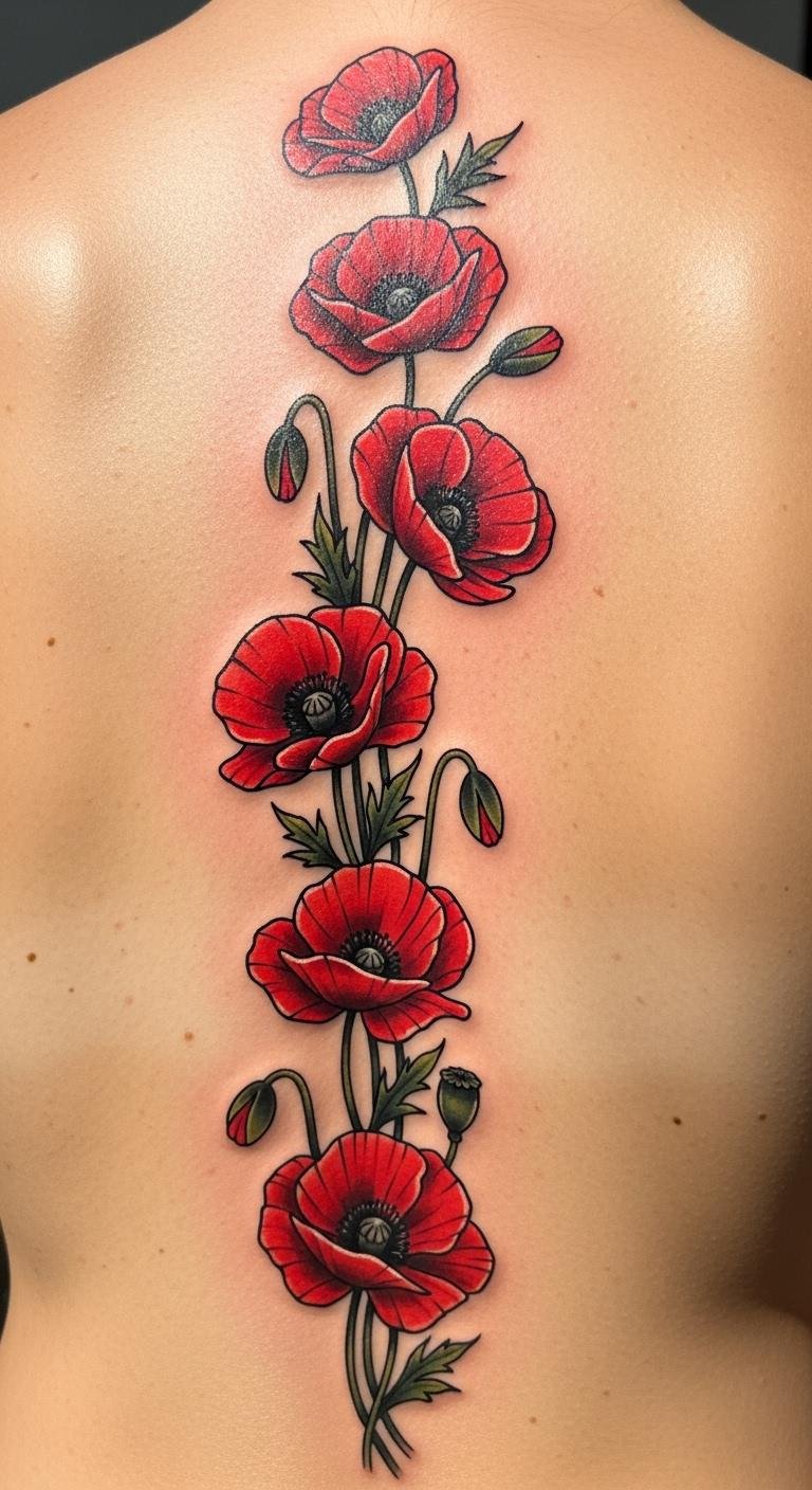 Vibrant poppies bring color to your spine. See red poppies in a row for energy. This stands out easily. Sessions at $100. Pick poppies for sketches. Protect with covers. Add a poppy accent. Paint at home. Use bright tones. It’s lively and fun.