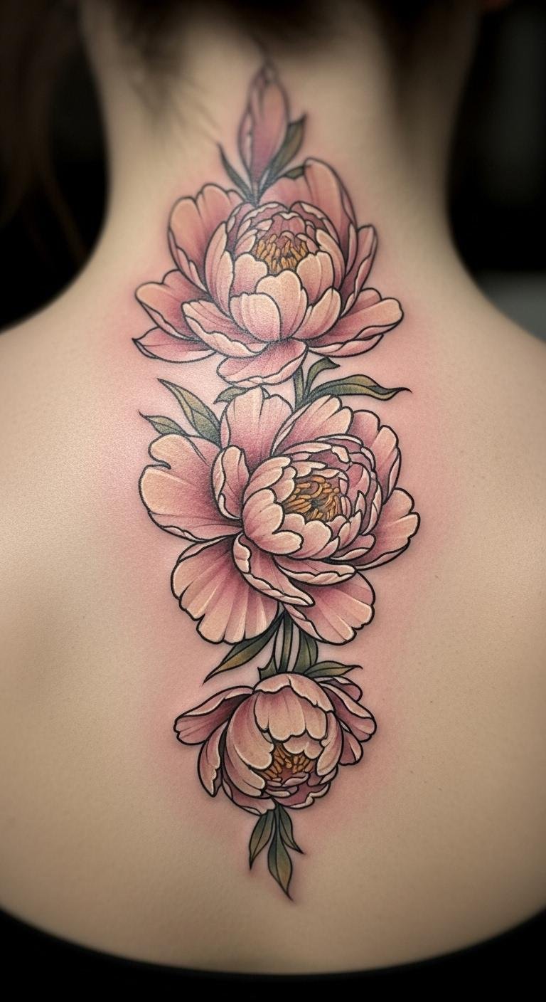 Peonies add bold petals to your spine for a romantic twist. Imagine full blooms climbing your back like a garden path. This design works for all skin types with its versatile size. Opt for affordable artists by checking community reviews—expect around $150 for medium work. Sketch peonies on paper first to adjust the flow. Use natural oils for healing to keep costs down. Combine with a shoulder leaf for symmetry. At home, practice with colored pencils to mimic the colors. Focus on petal layers for a 3D effect. It’s an easy way to feel connected to nature.