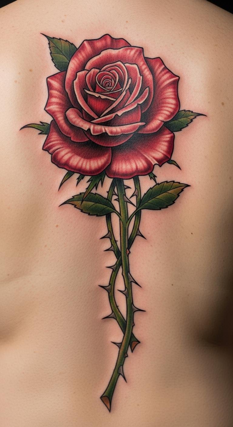 Realistic roses make your spine pop with lifelike details. See thorns and petals that almost feel real along your back. This choice appeals to those wanting depth in their ink. Find budget artists through social apps—prices hover at $200. Draw a rose from a photo to plan it out. Apply homemade balms like aloe for aftercare savings. Link it with a finger thorn for a set. Use free drawing tools online to create your version. Keep the shading light to ease the process. It’s straightforward for a personalized touch.