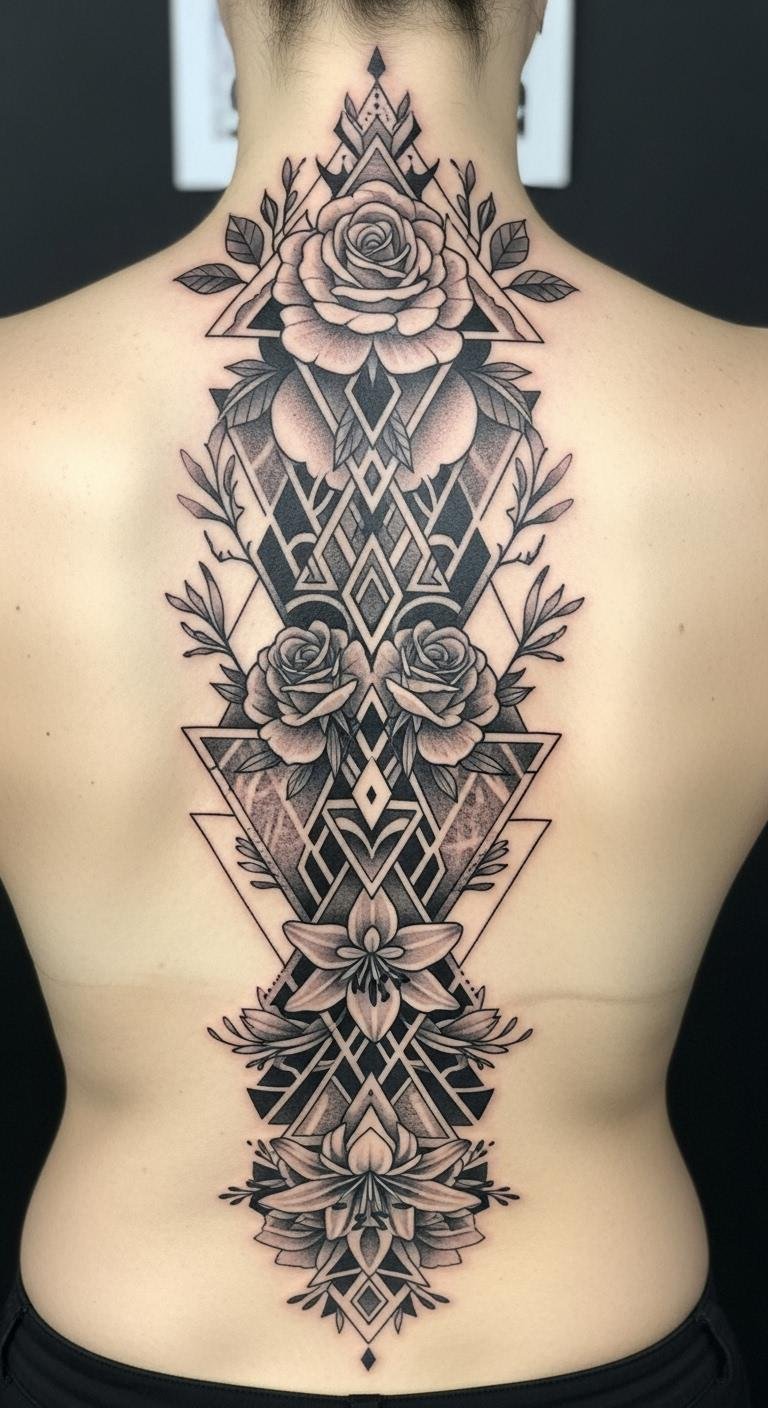 Geometric shapes with florals create a modern spine design. See triangles around petals for a unique blend. This style mixes trends without complexity. Look for deals at $150. Grid out shapes on paper first. Use basic bandages for care savings. Pair with a wrist geometric. Sketch with rulers at home. Balance elements for harmony. It’s a fresh take on classics.