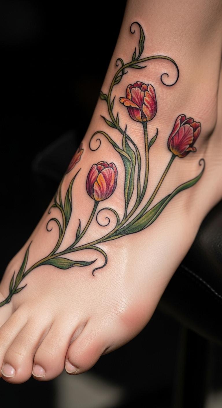 A vine with tulips on your foot means perfect love in motion. It adapts to your step. Select tulips for declaration. Draw with foot-shaped templates online for free. For cheap fun, use foot stamps. Make vines hug the arch. This spot costs around $60. Bold the tulip heads. Use string to fit it right. This idea makes walking art easy. It’s practical for active folks.