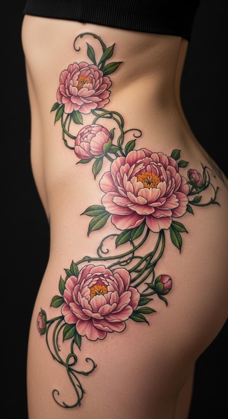 A vine with peonies on your hip symbolizes prosperity in curves. It fits like a secret. Choose peonies for wealth. Sketch with hip outlines from free sources. For affordable tests, use body crayons. Make vines follow the hip’s shape. This design is around $80. Bold the peony layers. Use fabric to trace on your hip. This idea keeps it personal and flowing. It’s great for hidden spots.
