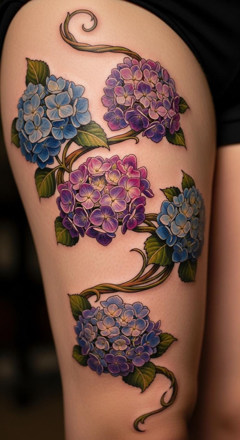 A vine with hydrangeas on your thigh means heartfelt emotion in bulk. It clusters with feeling. Pick hydrangeas for understanding. Draw clusters using free flower guides. For cheap previews, use washable inks. Let vines spread over the thigh. This design is under $120. Bold the hydrangea buds. Use string to map on your leg. This idea makes emotions visible. It’s bold yet thoughtful.