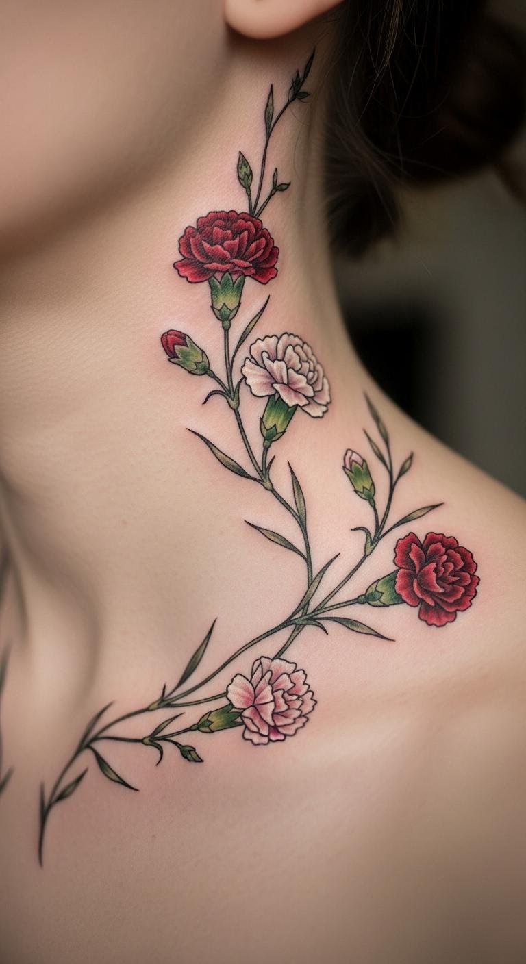 A vine with carnations on your neck means pure love up close. It frames your style. Choose carnations for admiration. Sketch with neck guides from free sites. For budget tests, use sticker versions. Keep it neat and curved. This design runs under $50. Bold the carnation petals. Use tape to outline. This idea enhances your look simply. It’s versatile for daily use.