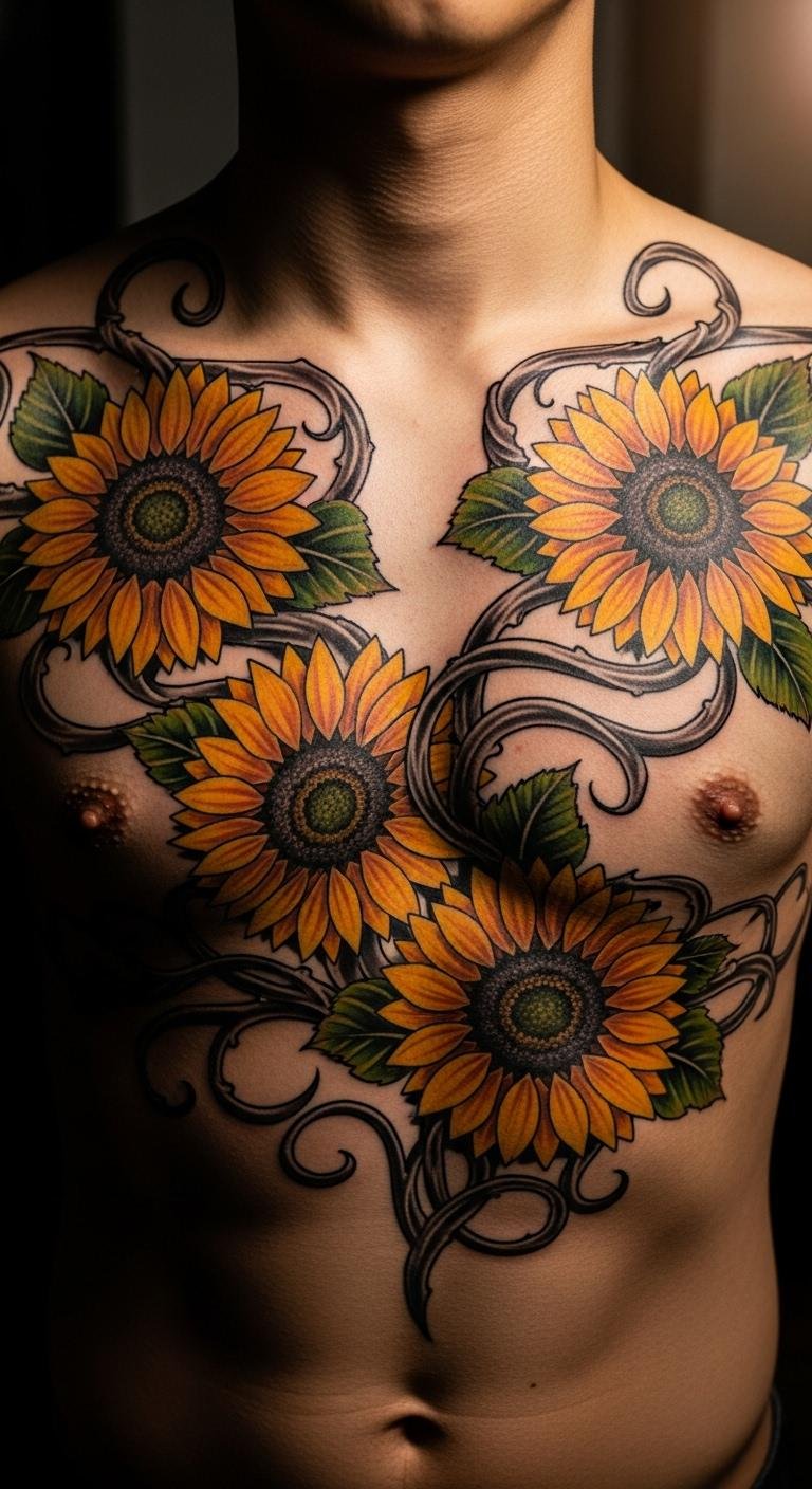 A vine with sunflowers on your chest represents admiration close to heart. It beams positivity. Use sunflowers for loyalty. Sketch with chest outlines. For affordable ideas, try chest stickers. Let vines spread wide. This piece is around $130. Bold the sunflower details. Use string for layouts. This idea warms the soul. It’s meaningful and bold.