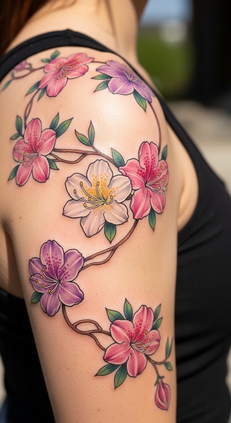 An azalea vine tattoo represents fragile passion on your shoulder. It spreads like a gentle story. Pick azalea for its tender emotion. Sketch with recycled paper and pens—free tutorials online guide you. For cheap tests, use fabric markers on cloth. Make vines branch out smoothly. This design costs about $70 at an affordable spot. Bold the flower centers to highlight. Use string to trace paths on your shoulder first. This idea makes planning easy. Add buds for extra flair. It’s ideal for showing off casually.
