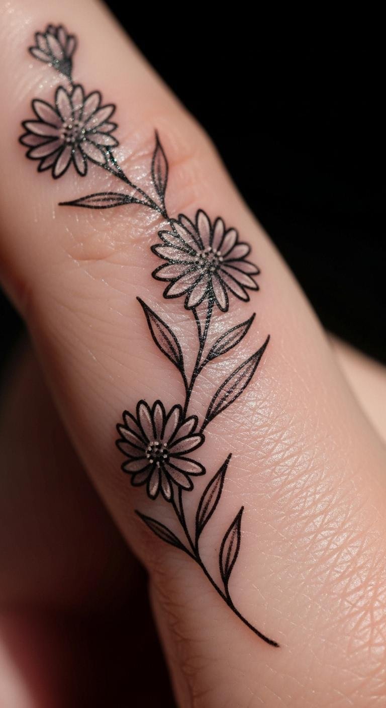 An aster vine tattoo signifies love around your finger. It acts like a personal ring. Choose aster for its delicate affection. Draw it with a simple pencil kit—grab ideas from free apps. For budget fun, ink with washable pens temporarily. Keep vines thin and wrapping. This small design runs under $40. Bold the tiny flowers for charm. Use thread to preview on your finger. This helps you decide fast. It’s perfect for subtle daily wear. Add leaves for a full look.