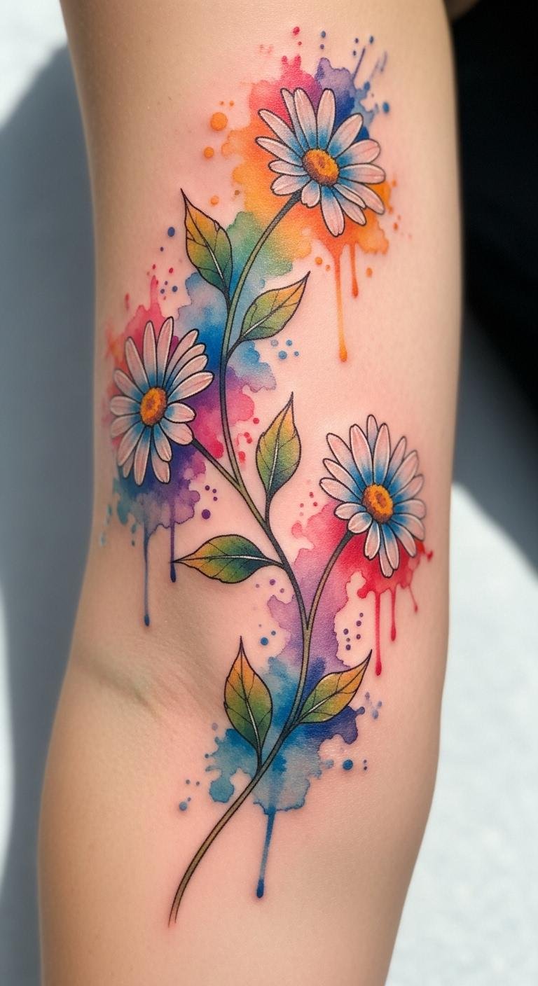 A watercolor vine with daisies brings fun color to your skin. It looks painted and fresh. Add daisies for innocence. Blend colors using free digital tools on your computer. For affordable practice, try watercolor paints on paper first. Make edges soft and flowing. This style fits for around $100. Bold the daisy petals for pop. Use a brush at home to mimic the look. This helps you visualize quickly. It’s a playful way to start.