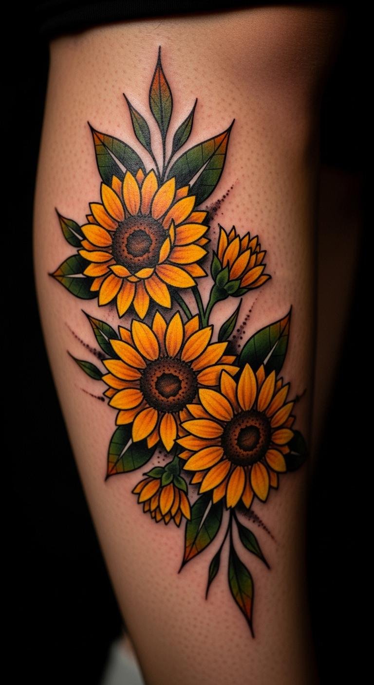 A neo-traditional vine with sunflowers adds bold energy to your leg. It pops with strong lines. Use sunflowers for happiness. Sketch bold shapes with markers—free videos show how. For cheap tests, draw on with eyeliner. Keep vines thick and lively. This design costs about $120. Bold the sunflower faces. Use tape to outline on your leg. This idea makes bold choices simple. It’s perfect for vibrant expression.