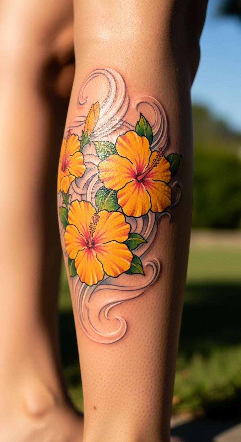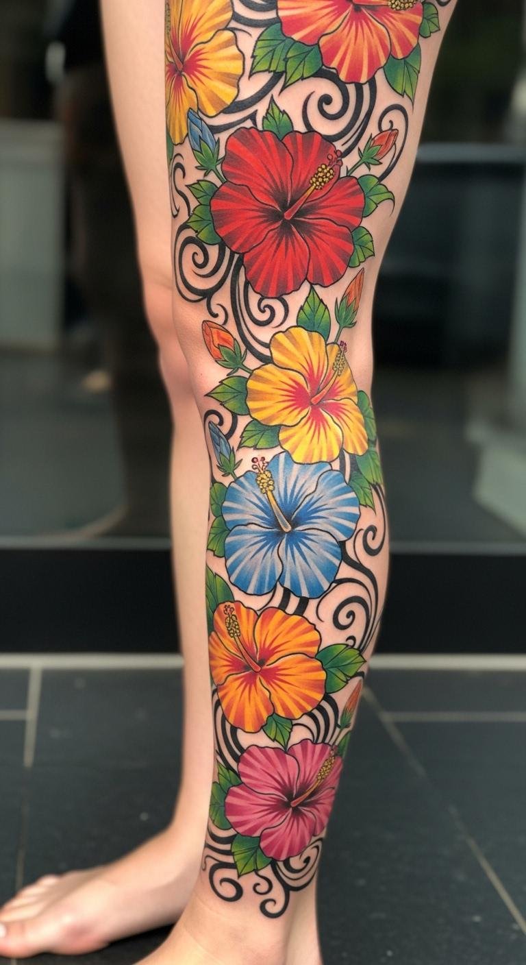 Build a vibrant hibiscus sleeve on your leg for full impact. Layer designs over time. Plan with free software. Split costs across visits. Include vines for flow. Preview with leg wraps. Show in shorts. Use daily creams. It creates a masterpiece gradually.