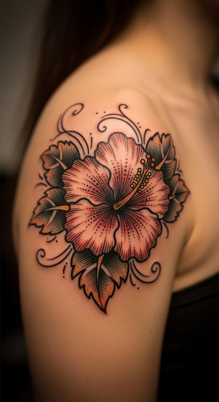 Go old-school with a vintage hibiscus on your shoulder for timeless charm. Think engraved lines that nod to history. Draw it out with a pencil on paper first. Search for budget artists who specialize in classic styles. Keep it small to cut costs. Try rubbing ink from a stamp to mimic the effect temporarily. Position it for easy hiding under clothes. Clean with gentle wipes you already own. This design adds character for events and feels personal without being loud.