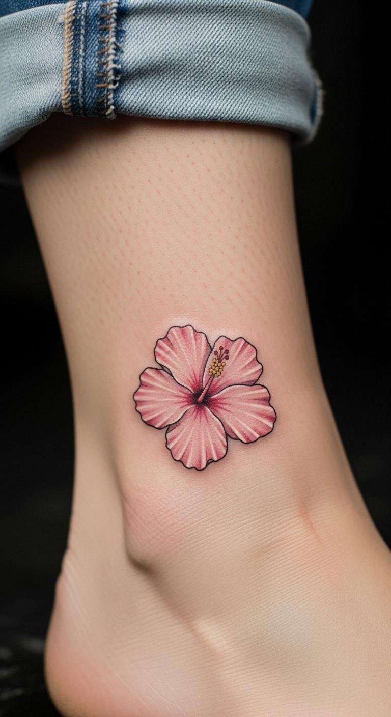 A feminine hibiscus on the ankle offers grace and subtlety. Opt for soft pinks that complement your style. Use nail polish to test designs at home. Find affordable artists through community groups. Add a bow for a custom touch. Wrap it in a bandana to preview daily wear. This spot works for dresses and keeps things discreet. Moisturize with everyday cream. It brings elegance to your step without high prices.