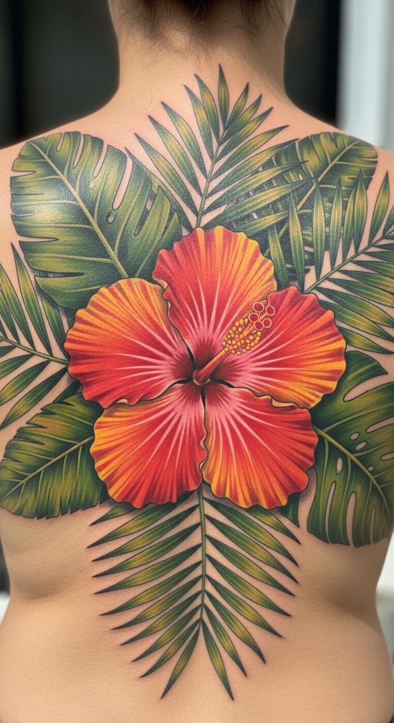 Make a statement with a tropical hibiscus on your back for adventure vibes. Include palm leaves for that island feel. Break it into sessions to manage costs. Use free apps to design and visualize. Add elements like the sun for personalization. Cover with old shirts while healing. This large piece suits vacations and feels epic. Maintain with household oils you have.