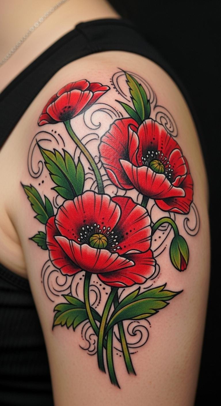 Neo-traditional poppies add bold flair to your shoulder. They mix old and new styles. Find free templates to inspire you. Draw with markers you already have. Choose artists with budget-friendly rates. Limit colors for savings. Position for a strong look. Experiment via digital mocks. Stick to essential elements. Book when deals are available. Try fabric designs as previews. Keep it vibrant and simple.