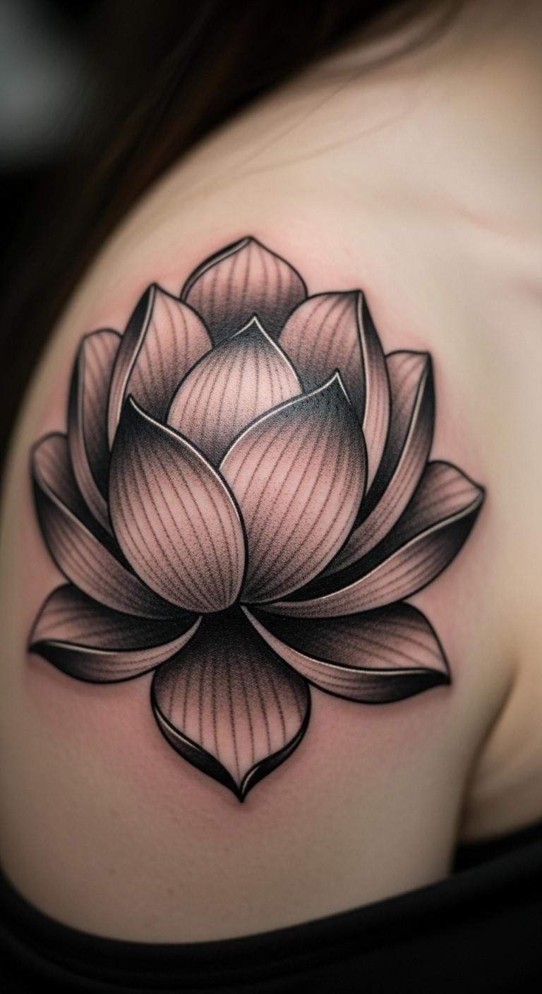 Shaded lotuses give depth to your shoulder. The gradients make them stand out. Practice shading with pencils at home. Use online videos for tips. Find low-cost artists for this. Keep shading light. Fit it to your body’s flow. Preview on your device. Choose economical materials. Time it right for discounts. Experiment with shadows yourself. Make it layered yet simple.