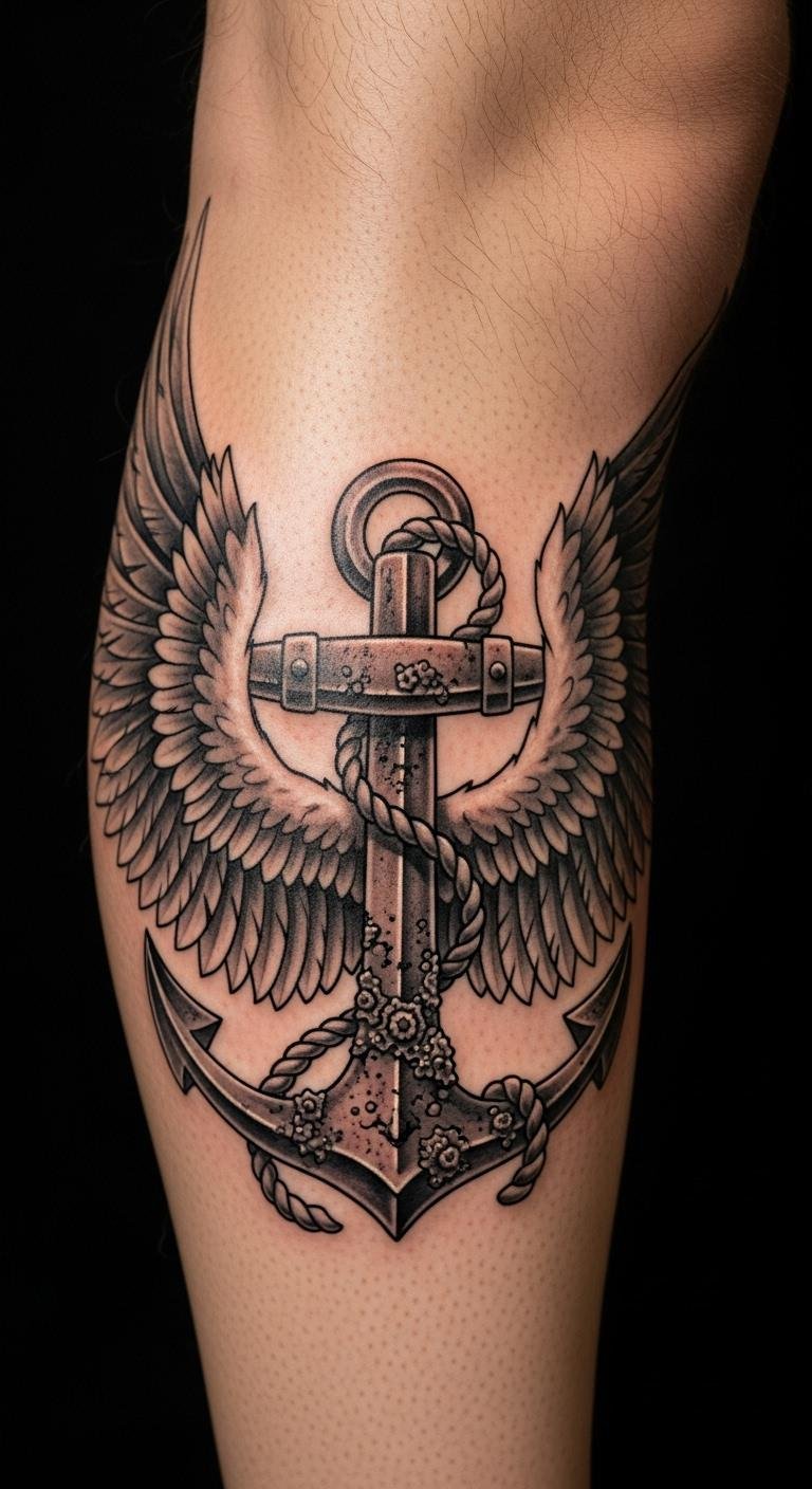 Anchor with wings mixes stability and freedom. Think of it as your grounded flight. Use string to outline at home—free and quick. Budget stickers mimic the design for pocket change. Put it on your leg for balance. Customize with an artist easily. Simple shades work well. Add waves for depth. This one holds firm. DIY options make it fun.