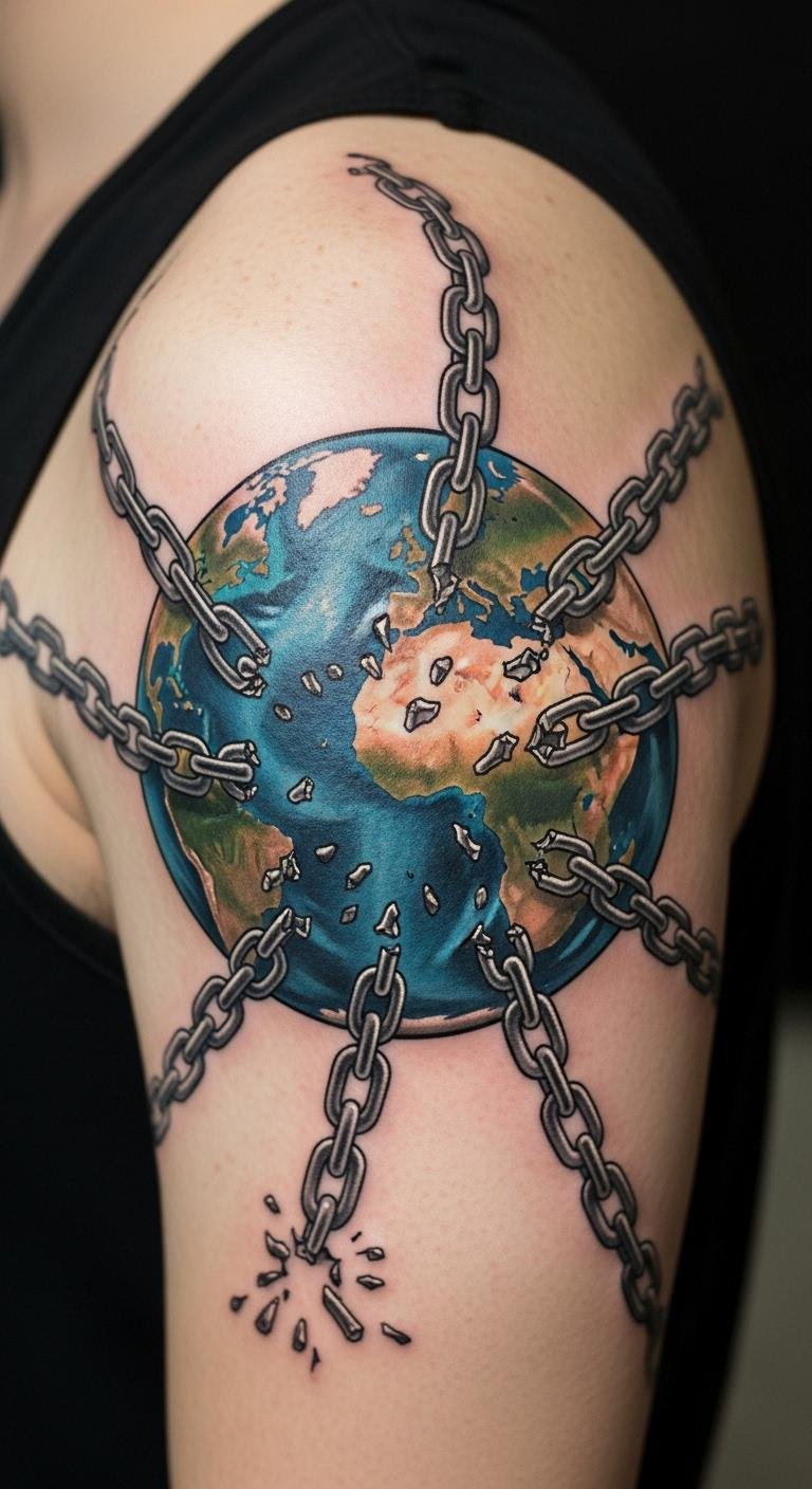 Globe with chains breaking means worldwide free. Think of it as your global statement. Map it on paper quickly. Affordable prints let you try it out. Place on your shoulder for reach. Work with an artist on basics. Single tones help savings. Include landmarks. This design expands horizons. Simple tools assist.