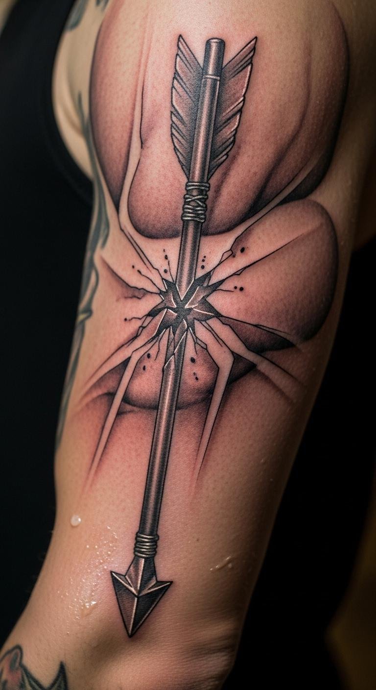 Arrow breaking free pierces through. Think of it as your thrust ahead. Outline arrows at home. Budget arrow stickers work. Place on your arm for aim. Discuss breaks with an artist. Sharp edges help savings. Add feathers. This design hits target. Simple tools launch it.