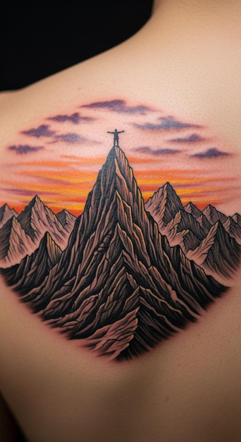 Mountain peak escape means conquering heights. View it as your climb to freedom. Use a free app on your phone to sketch it digitally first. Sticker versions from online sites cost little and peel off easy. Place it on your back for impact. Chat with an artist about basic shapes. Black ink keeps it affordable. Add a path for your story. This design inspires action. Home drawing tools get you started fast.