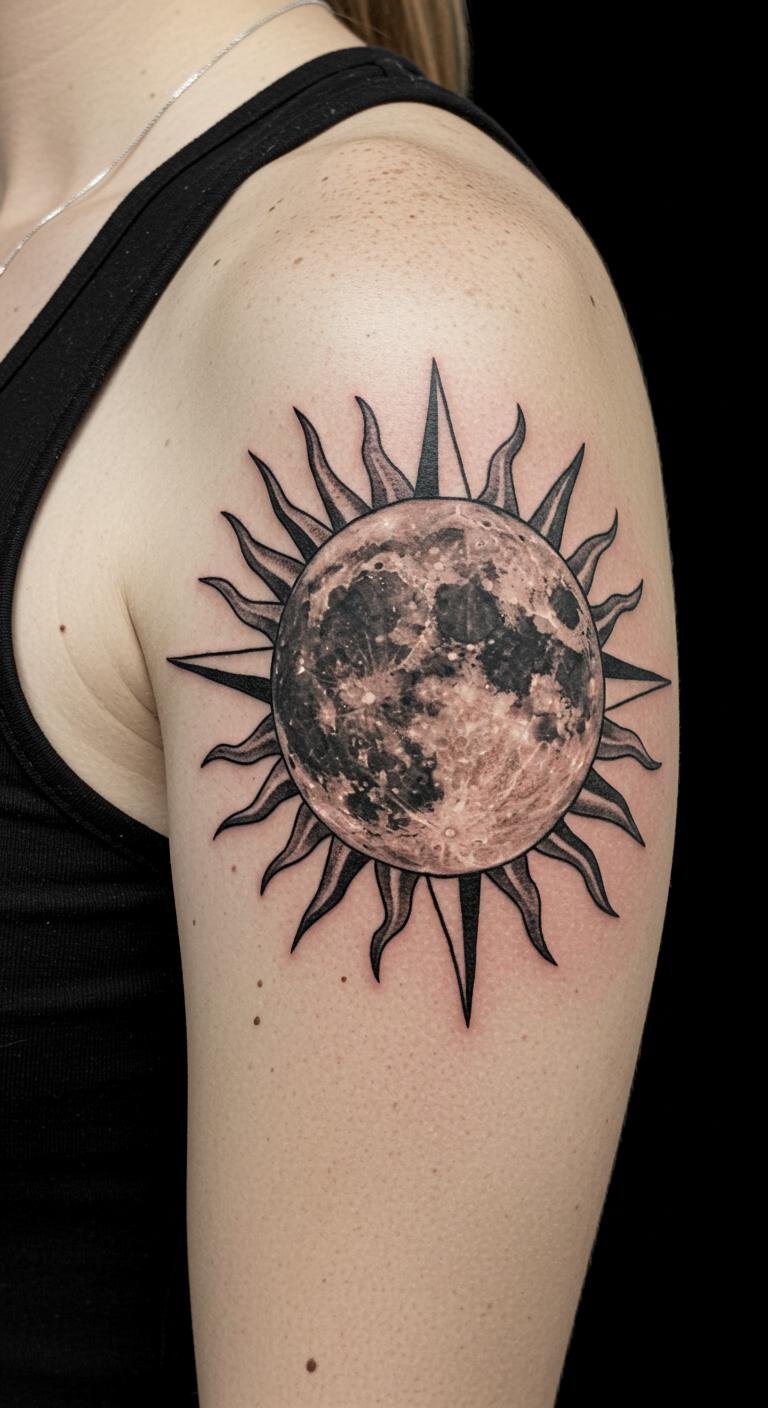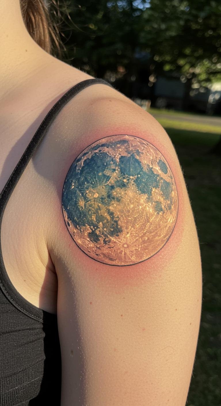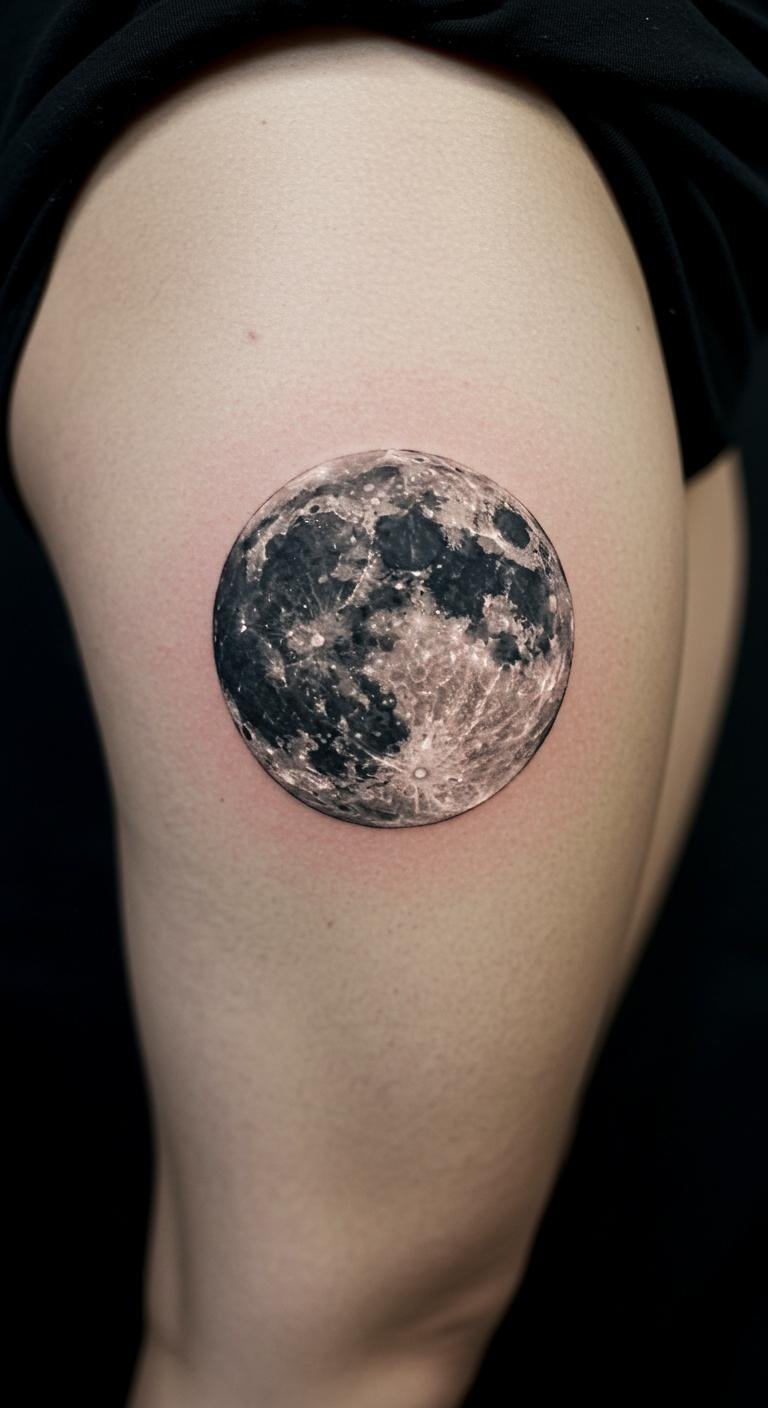 Add stars around a full moon for a night sky feel. This makes it pop. Shoulder placement is ideal. Artists might charge $160. Try DIY with glow-in-the-dark stickers first—costing pennies. Draw stars with a fine tip. Use phone apps for star patterns. Keep the moon central. Stars add personality without extra cost. This design shines in photos.