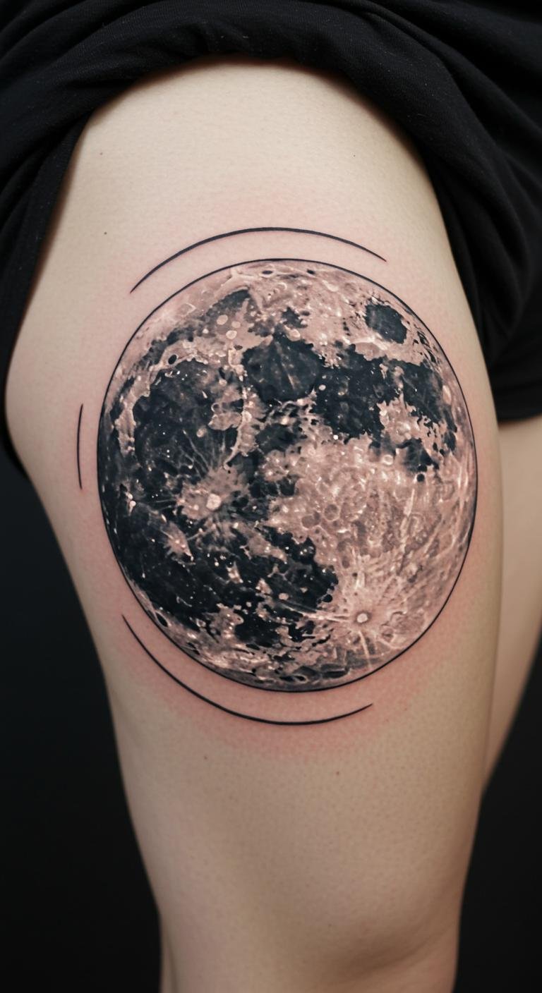 Place a full moon on the thigh for elegance. It’s hidden yet bold. Thigh offers curve. Expect $150. Wrap a string around for size—free. Draw with washable ink. Add vines for flair. Thigh designs heal with cover. Elegant and versatile.